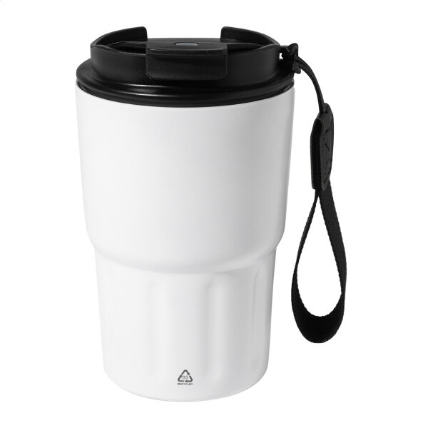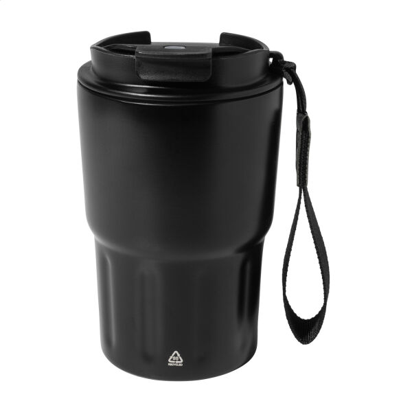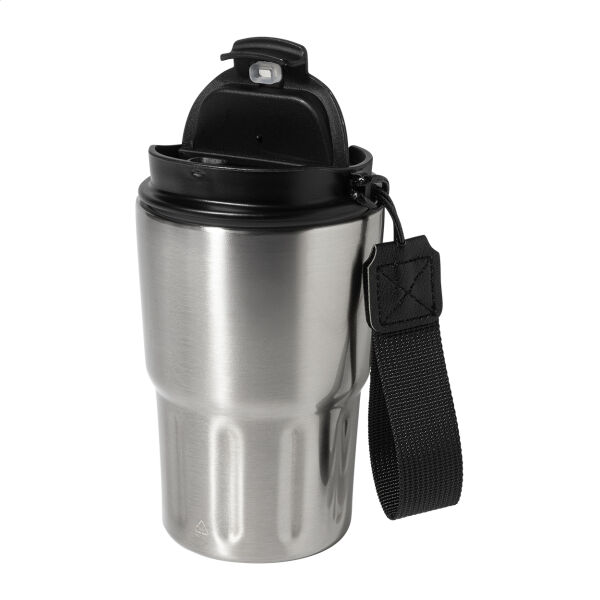Dubbelwandige, gerecyclede roestvrijstalen geïsoleerde thermokop met PP-drinkdeksel. Met RPET polyester draagband. 350 ml.